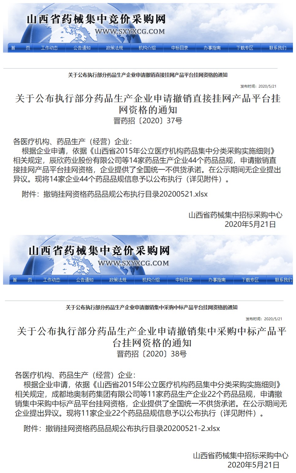 經(jīng)濟日報-中國經(jīng)濟網(wǎng)5月28日訊(記者朱國旺 郭文培)5月21日,山西省藥品集中競價采購網(wǎng)發(fā)布兩則《關于公布執(zhí)行部分藥品生產(chǎn)企業(yè)申請撤銷集中采購中標產(chǎn)品平臺掛網(wǎng)資格的通知》。通知顯示,辰欣藥業(yè)股份有限公司等25家藥品生產(chǎn)企業(yè)66個藥品品規(guī),申請撤銷集中采購中標產(chǎn)品平臺掛網(wǎng)資格,企業(yè)提供全國統(tǒng)一不供貨承諾。