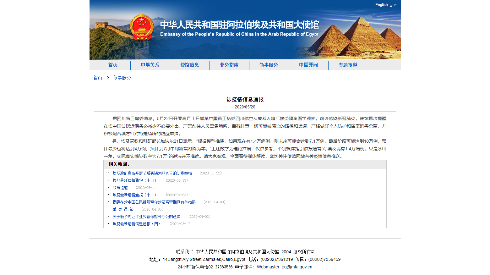 經(jīng)濟日報-中國經(jīng)濟網(wǎng)5月28日訊(記者朱國旺 郭文培)5月26日,中華人民共和國駐阿拉伯埃及共和國大使館官網(wǎng)發(fā)布《涉疫情信息通報》稱,個別媒體報道有關(guān)“埃及現(xiàn)有1.4萬病例,只是冰山一角,實際真實感染數(shù)字為7.1萬”的說法并不準確。