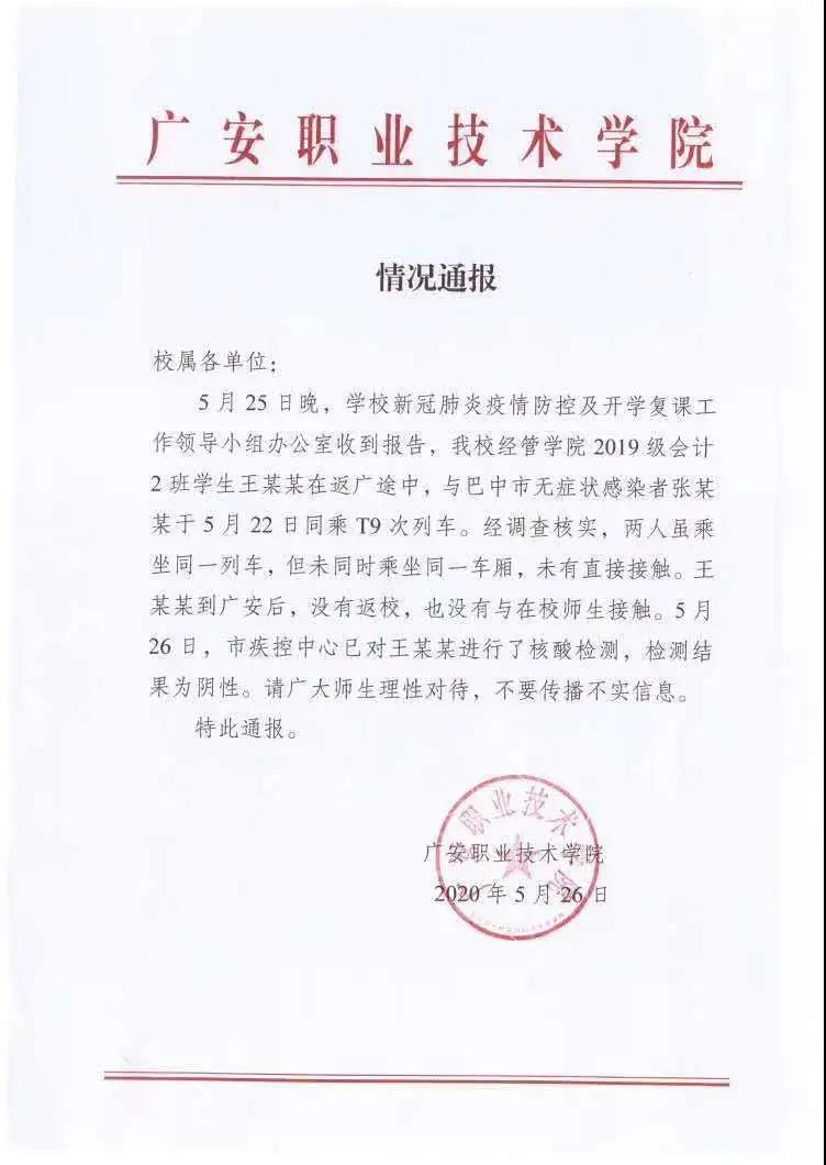 公告稱, 5月25日晚,廣安職業(yè)技術(shù)學(xué)院新冠肺炎疫情防控及開學(xué)復(fù)課工作領(lǐng)導(dǎo)小組辦公室收到報告,該校經(jīng)管學(xué)院2019級會計2班學(xué)生王某某在返廣(安)途中,與巴中市無癥狀感染者張某某于5月22日同乘T9次列車。經(jīng)調(diào)查核實,兩人雖乘坐同一列車,但未同時乘坐同一車廂,未有直接接觸。王某某到廣安后,沒有返校,也沒有與在校師生接觸。5月26日,廣安市疾控中心對王某某進行核酸檢測,檢測結(jié)果為陰性。