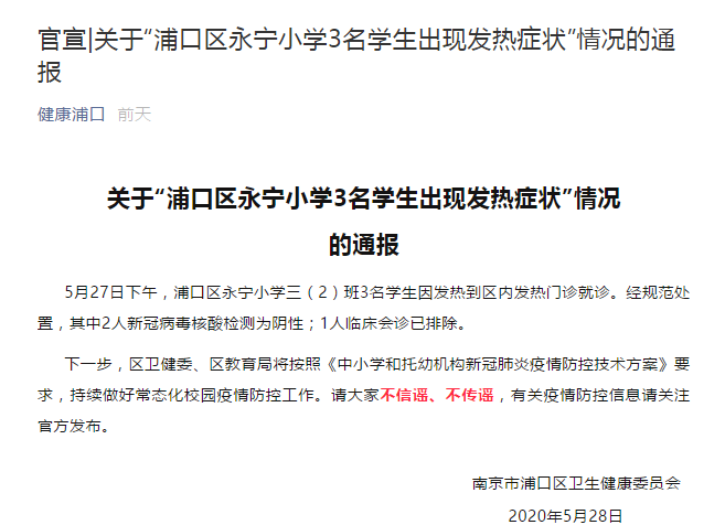 針對(duì)網(wǎng)絡(luò)傳言“南京浦口永寧小學(xué)發(fā)生聚集性疫情,導(dǎo)致全班停課。”5月28日, 南京市浦口區(qū)衛(wèi)生健康委員會(huì)官微“健康浦口”發(fā)布《關(guān)于“浦口區(qū)永寧小學(xué)3名學(xué)生出現(xiàn)發(fā)熱癥狀”情況》澄清事實(shí)。