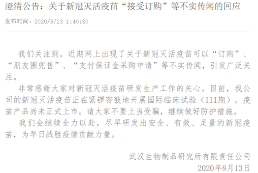 經(jīng)濟(jì)日?qǐng)?bào)-中國(guó)經(jīng)濟(jì)網(wǎng)8月13日訊(記者朱國(guó)旺 郭文培)近期,網(wǎng)上出現(xiàn)了關(guān)于新冠滅活疫苗可以“訂購”、“朋友圈兜售”、“支付保證金采購申請(qǐng)”等不實(shí)傳聞,引發(fā)廣泛關(guān)注。8月13日,武漢生物制品研究所有限責(zé)任公司對(duì)此澄清:“目前,我公司的新冠滅活疫苗正在緊鑼密鼓地開展國(guó)際臨床試驗(yàn)(III期),疫苗產(chǎn)品尚未正式上市。請(qǐng)大家不要上當(dāng)受騙,繼續(xù)做好防護(hù)措施。”