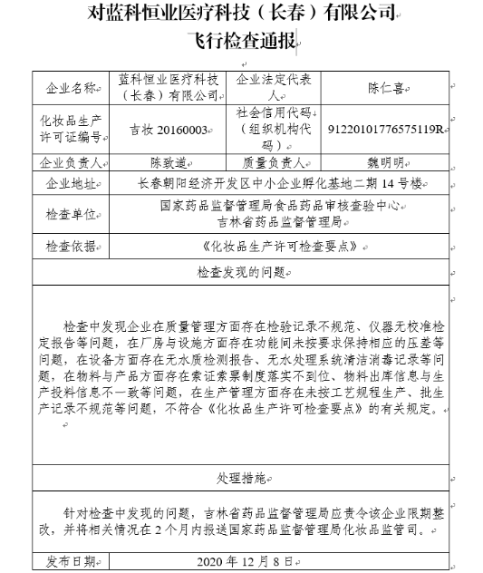 針對(duì)檢查中發(fā)現(xiàn)的問(wèn)題,國(guó)家藥監(jiān)局要求吉林省藥品監(jiān)督管理局應(yīng)責(zé)令該企業(yè)限期整改,并將相關(guān)情況在2個(gè)月內(nèi)報(bào)送國(guó)家藥品監(jiān)督管理局化妝品監(jiān)管司。