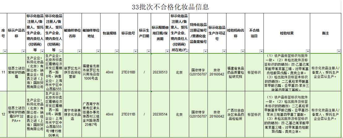 通告顯示,經(jīng)福建省食品藥品質(zhì)量檢驗(yàn)研究院及廣西壯族自治區(qū)食品藥品檢驗(yàn)所檢驗(yàn),生產(chǎn)企業(yè)為科瑪化妝品(北京)有限公司,銷售企業(yè)為紐西之謎(上海)國際貿(mào)易有限公司生產(chǎn)的紐西之謎日常呵護(hù)防曬霜、紐西之謎日常呵護(hù)防曬霜SPF32 PA++產(chǎn)品不合格。