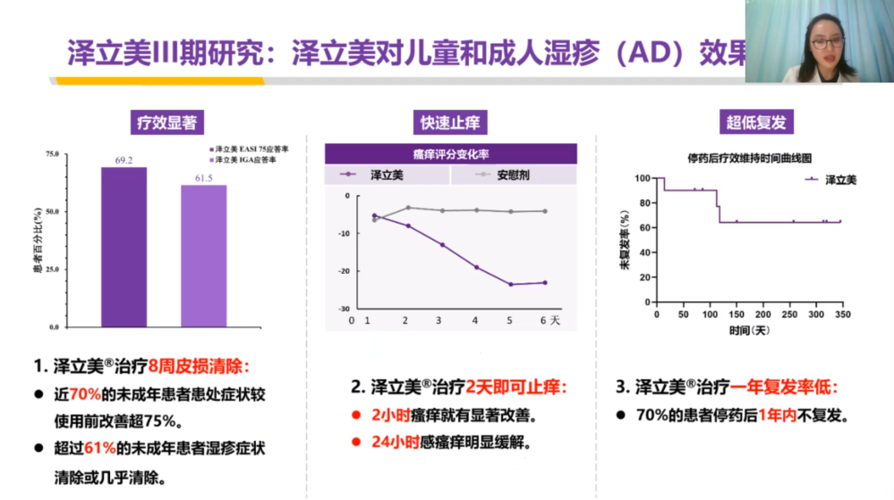 趙琰教授還分享了澤立美重要臨床數(shù)據(jù):"在為期8周的III期臨床試驗中,澤立美組61.5%的患者實現(xiàn)皮損完全清除,瘙癢改善最快僅需2小時。更可喜的是,停藥1年后仍有70%患者維持緩解狀態(tài)。"相比美國市場1400美元/支的售價,該藥國內(nèi)定價僅360元,大大減輕患者經(jīng)濟負(fù)擔(dān)。