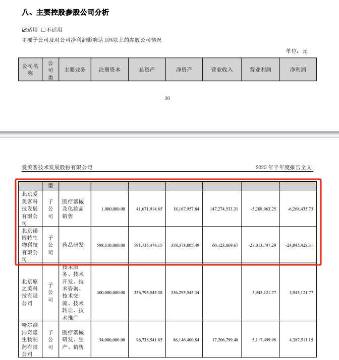 具體來(lái)看,其主要控股參股公司表現(xiàn)并不樂觀。半年報(bào)顯示,愛美客主要子公司及對(duì)公司凈利潤(rùn)影響達(dá)10%以上的參股公司有4家,其中2家處于虧損狀態(tài)。北京愛美客科技發(fā)展有限公司凈利潤(rùn)為-6268435.73元,北京諾博特生物科技有限公司凈利潤(rùn)為-24045428.31元,2家虧損金額逾3000萬(wàn)元。