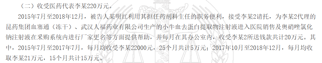 根據(jù)判決書,2015年7月至2018年12月,被告人某明紅利用其擔(dān)任藥劑科主任的職務(wù)便利,接受“李某2”請托,為“李某2”代理的昆藥集團(tuán)血塞通(凍干)、武漢人福藥業(yè)有限公司生產(chǎn)的小牛血去蛋白提取物注射液進(jìn)入醫(yī)院銷售及奧硝唑氯化鈉注射液在釆購系統(tǒng)內(nèi)進(jìn)行廠家更名等方面提供幫助,并每月在其辦公室內(nèi),收受“李某2”所送錢款共計20萬元。