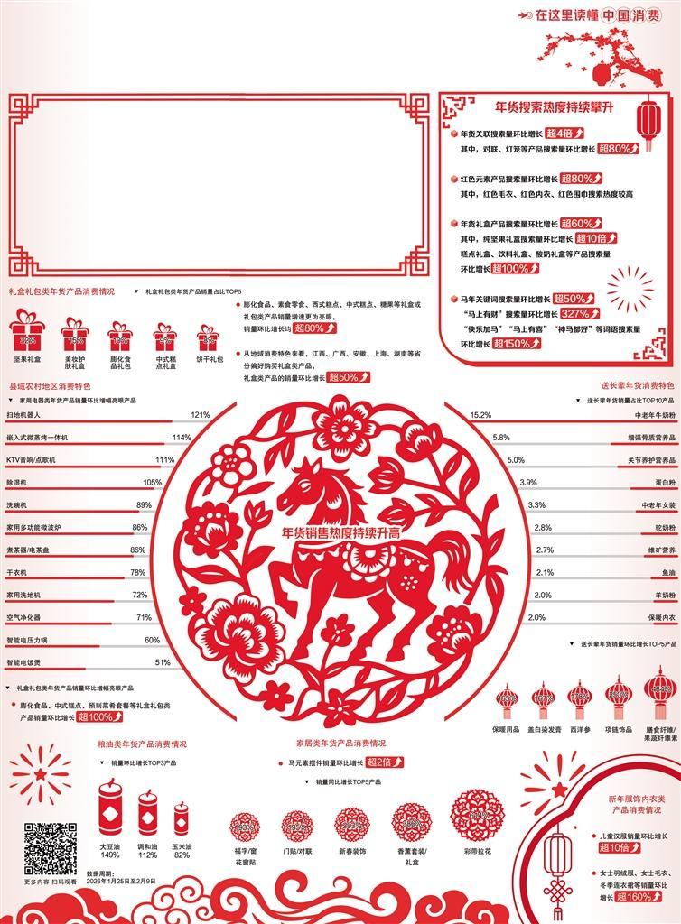 當(dāng)前,年貨消費(fèi)呈現(xiàn)出“新舊融合、多元拓展”的顯著特征。一方面,承載吉祥寓意的“好彩頭年貨”持續(xù)走熱。其中,紅色元素全面滲透年貨消費(fèi)場(chǎng)景,在最受消費(fèi)者喜愛的紅元素年貨品類中,窗花、福字、燈籠、中國結(jié)等傳統(tǒng)裝飾產(chǎn)品持續(xù)熱銷,成為打造家庭年味氛圍的首選。同時(shí),“馬年”關(guān)鍵詞搜索量環(huán)比大幅增長(zhǎng),生肖酒、對(duì)聯(lián)、玩偶、抱枕等產(chǎn)品的搜索量環(huán)比增幅均超過80%。各類搭配馬年吉祥祝福的產(chǎn)品熱銷,在“龍馬精神”“馬上有?!薄耙获R當(dāng)先”等祝福語加持下,不少馬年禮盒類產(chǎn)品受到消費(fèi)者歡迎。