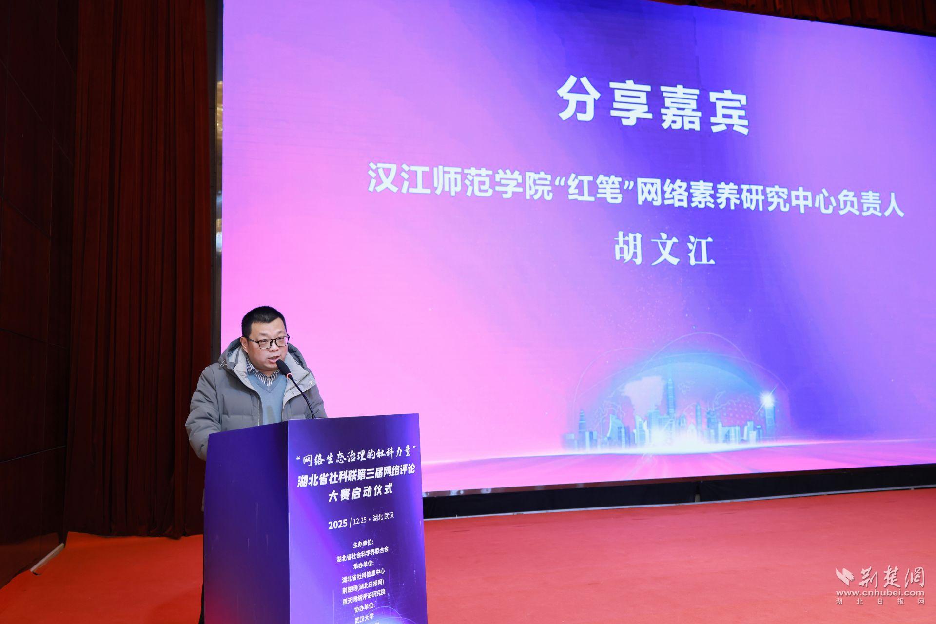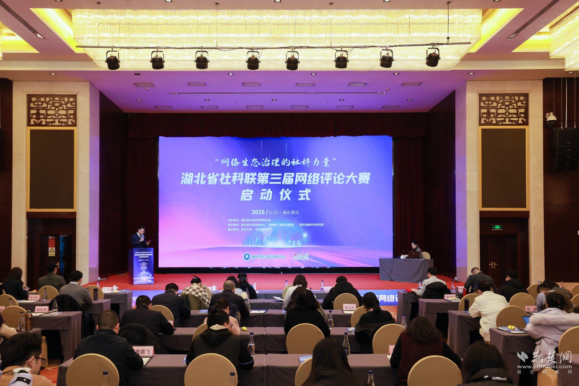 荊楚網(wǎng)(湖北日報(bào)網(wǎng))訊 (記者 丁楚風(fēng))冬日蓄勢,春潮待發(fā)。12月25日,武漢楚天粵海國際大酒店內(nèi)暖意融融,思想的火花在這里迸發(fā)碰撞。由湖北省社會科學(xué)界聯(lián)合會主辦,湖北省社科信息中心、荊楚網(wǎng)(湖北日報(bào)網(wǎng))、楚天網(wǎng)絡(luò)評論研究院承辦的“網(wǎng)絡(luò)生態(tài)治理的社科力量”——湖北省社科聯(lián)第三屆網(wǎng)絡(luò)評論大賽正式啟動(dòng)。