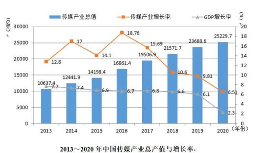 根據(jù)“傳媒藍(lán)皮書(shū)”課題組的統(tǒng)計(jì),2000年中國(guó)傳媒產(chǎn)業(yè)總產(chǎn)值只有1500億元,2013年突破了1萬(wàn)億元,2018年突破了2萬(wàn)億元,2020年雖受疫情影響但依然正向增長(zhǎng)根據(jù)“傳媒藍(lán)皮書(shū)”課題組的統(tǒng)計(jì),2020年中國(guó)傳媒產(chǎn)業(yè)總產(chǎn)值達(dá)25229.7億元,同比增長(zhǎng)6.51%,雖然增長(zhǎng)率較2019年下跌3.3個(gè)百分點(diǎn),但依然高于GDP增長(zhǎng)率。傳媒細(xì)分領(lǐng)域呈現(xiàn)兩極化發(fā)展態(tài)勢(shì),報(bào)刊、圖書(shū)、電影等傳統(tǒng)領(lǐng)域業(yè)務(wù)受疫情影響收入有所下降,但網(wǎng)絡(luò)視聽(tīng)、網(wǎng)絡(luò)廣告、網(wǎng)絡(luò)游戲等互聯(lián)網(wǎng)業(yè)務(wù)在疫情背景下的“宅經(jīng)濟(jì)”中卻呈超常發(fā)展態(tài)勢(shì)。