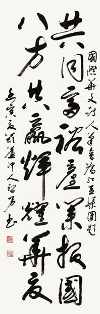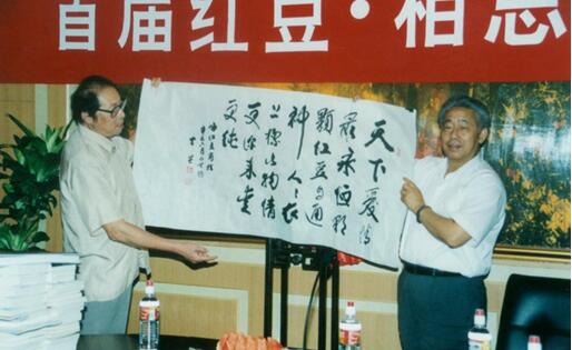 在《七夕,紅豆最相思的詩意探訪》論壇主題引導(dǎo)下,詩人們暢談紅豆愛情詩的淵源,以及對中國新詩的助推、發(fā)展的歷史作用,使中華文化傳統(tǒng)薪火相傳,在我們這一代詩人手里發(fā)揚(yáng)光大,繪出獨(dú)特的、現(xiàn)代人審美的愛情詩篇。會上,北京電視臺節(jié)目主持人、詩人黃殿琴朗誦了張?jiān)妱Α⒐鹋d華、綠島寫的紅豆愛情詩歌,并展示了多位詩人等為紅豆集團(tuán)寫的多幅書法,表達(dá)了友誼深情?!肮餐辉.a(chǎn)業(yè)報國 八方共贏輝煌華夏”是詩人黎勇先生寫給紅豆集團(tuán)的書法 ,國際華文詩人筆會主席張?jiān)妱懡o紅豆集團(tuán)書法為“紅豆最相思”等。