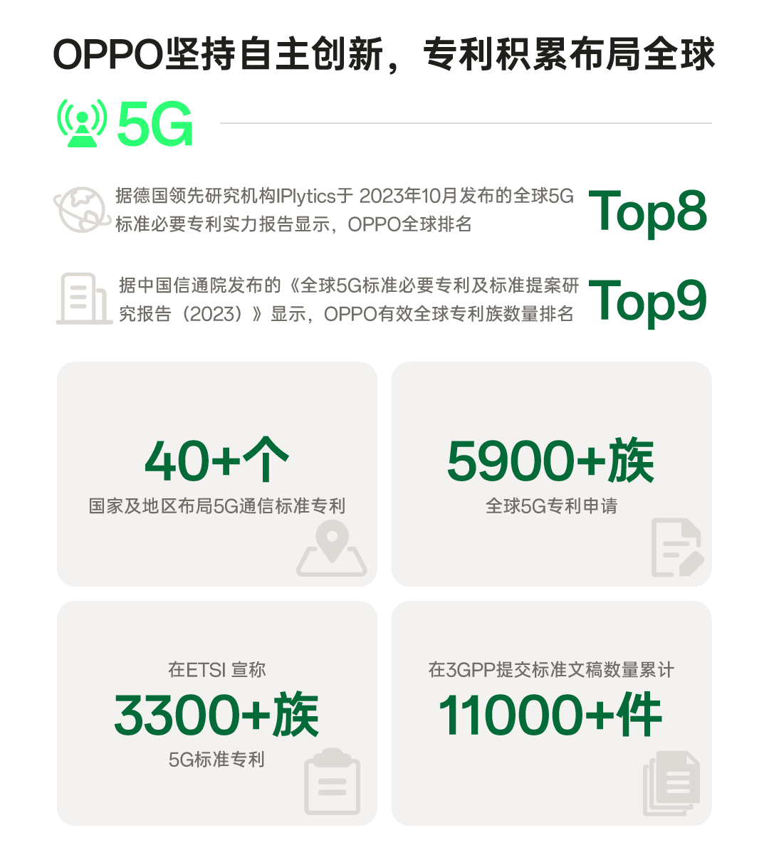 截至2023年12月31日,OPPO在全球40多個國家和地區(qū)布局5G通信標(biāo)準(zhǔn)專利,共完成5900+族全球?qū)@暾?,在ETSI聲明3300+族5G標(biāo)準(zhǔn)專利,在3GPP提交標(biāo)準(zhǔn)文稿數(shù)量累計超過11000件。根據(jù)中國信通院發(fā)布的《全球5G標(biāo)準(zhǔn)必要專利及標(biāo)準(zhǔn)提案研究報告(2023)》和IPlytics 在2023年10月發(fā)布的《全球5G標(biāo)準(zhǔn)必要專利實(shí)力報告》,OPPO 5G標(biāo)準(zhǔn)必要專利實(shí)力全球綜合排名均位居前列。