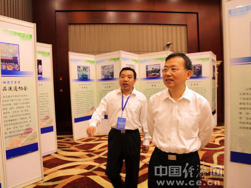 2013年全國食品安全宣傳周啟動儀式暨第五屆中國食品安全論壇6月17日在北京舉辦,今年主題為“社會共治 同心攜手維護食品安全”。圖為公安部副部長黃明(右)參觀食品安全“誠信守望者”展覽。中國經(jīng)濟網(wǎng) 王耀峰/攝