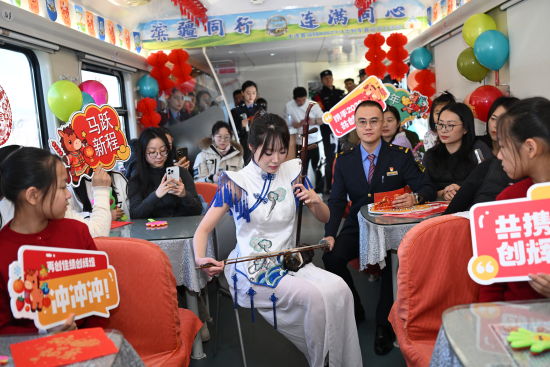 文藝表演環(huán)節(jié)精彩迭出,為旅途注入鮮活氣息。一曲《美麗家園》唱出游子對故鄉(xiāng)的深情眷戀,喚起旅客心中共同的團圓情結(jié);舞蹈《草原花正開》以舒展的舞姿、明快的節(jié)奏,勾勒出草原的遼闊生機,仿佛提前帶來春的氣息;二胡獨奏《賽馬》激昂奔放,弦音如蹄,奏響新春的蓬勃朝氣,引來陣陣掌聲;《烏蘭巴托的夜》深情悠遠,撫慰旅途思念,增添一抹詩意的溫暖;最后的器樂彈唱《奔跑》以熟悉旋律點燃全場,傳遞出向前奮進的青春力量。